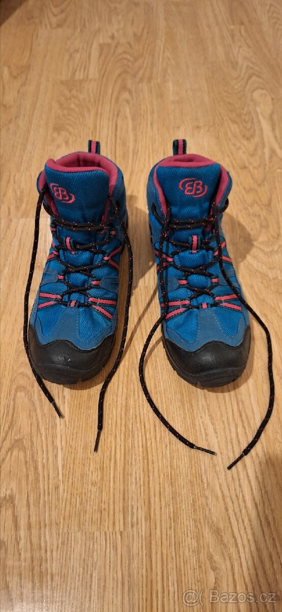 Dívčí outdoorové boty zn. Brütting, vel. 38, s membránou Comfortex, podrážkou Vibram, extra impregnované. Nošené jednu sezónu, stélky nepoužité - používali jsme speciální. Ve velmi dobrém stavu, pouze jedna oděrka na pravé špičce - viz foto.