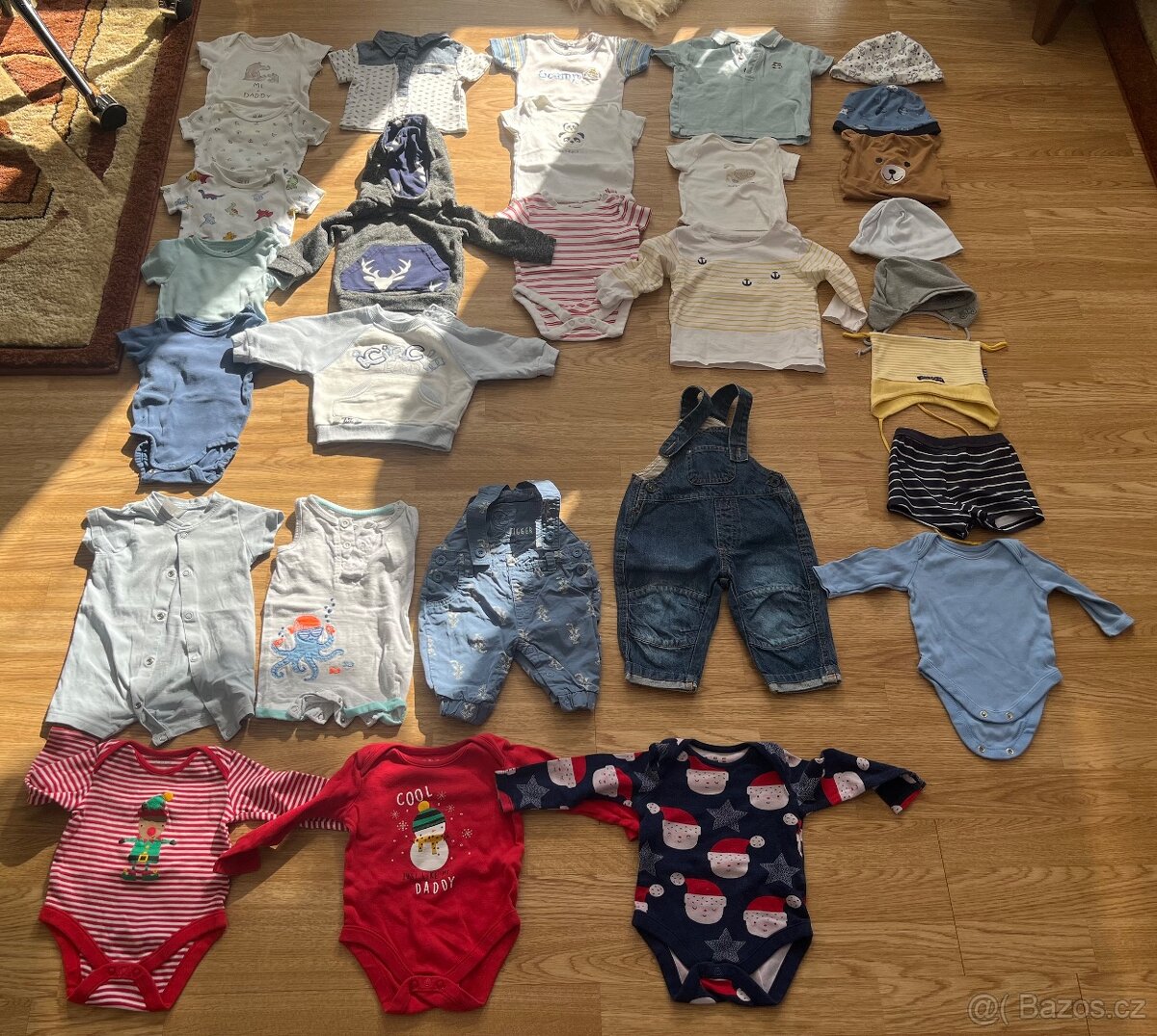 - body s krátkým (2-4m), overalky, mikinky, body s dlouhým rukávem (2-6m), zahradníčky, trička, plavky, župánek, čepičky, dupačky (62-80).