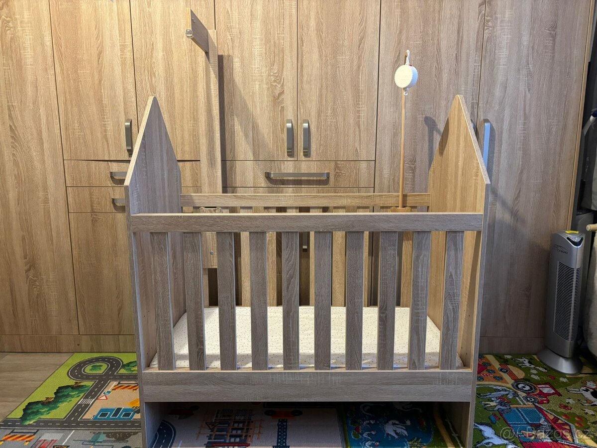 Prodám dětskou postýlku vyrobenou na míru na rozměr matrace 120x60cm. Možno nastavit na 3 výškové polohy. Součástí postýlky je i držák na chůvičku s kamerou a matrace. Cena 3500,-, pouze osobní odběr Sušice.