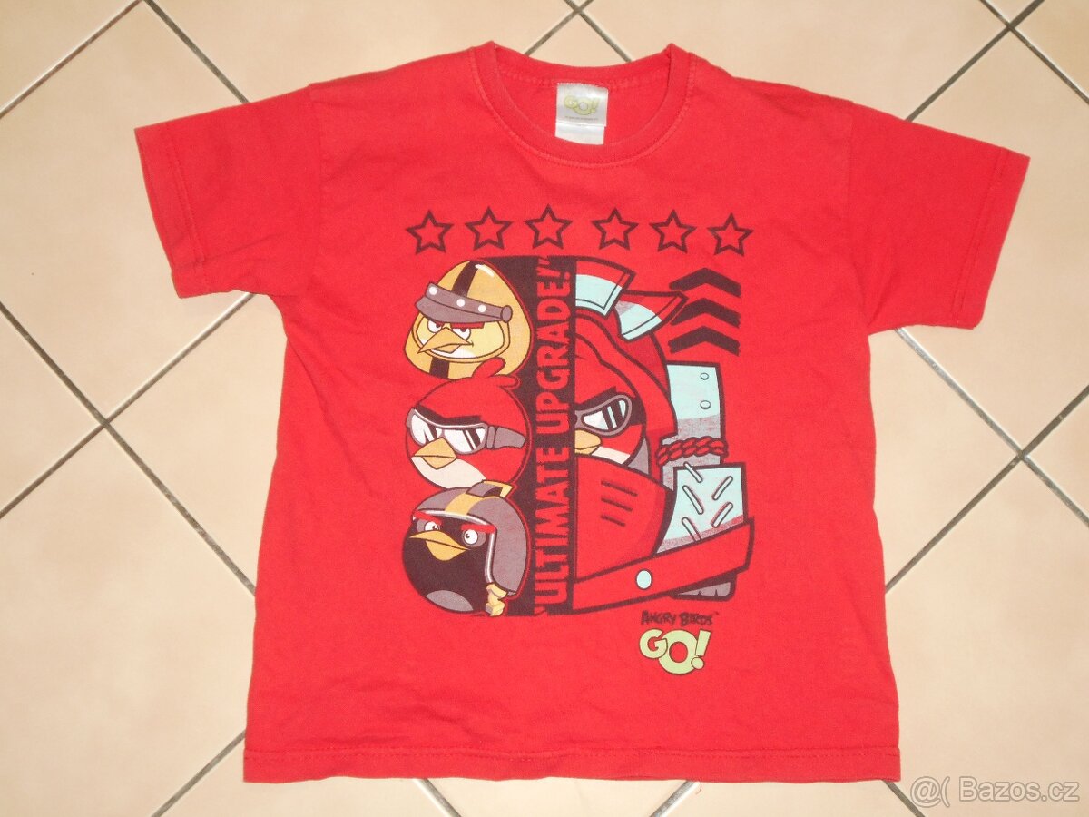 Nabízím pro chlapce červené tričko s krátkými rukávy na 6/7 let, zn.Angry birds. Vepředu velký obrázek, délka zad od ramene dolů 46cm, šíře přes hrudník 2x38cm, materiál bavlna. Tričko je v pěkném stavu.