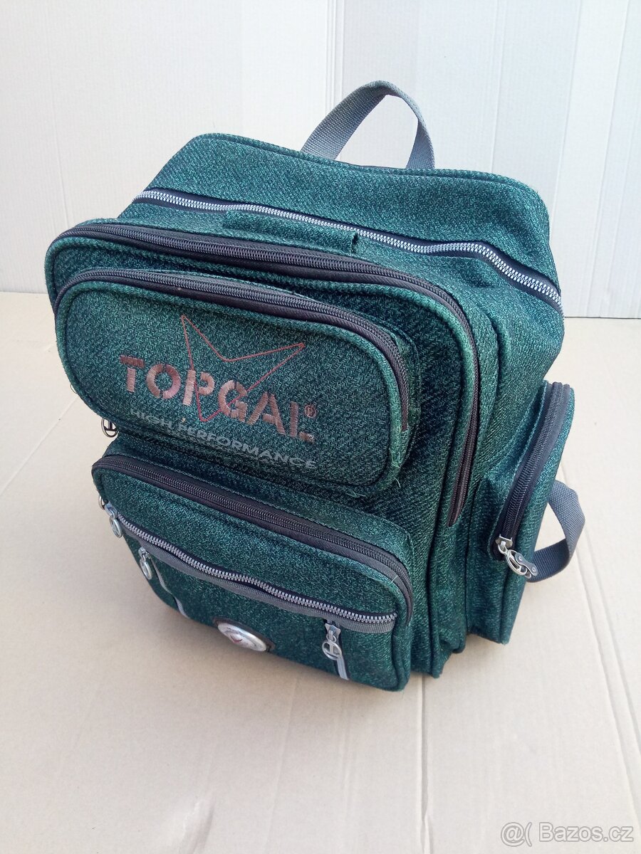 Velmi pěkný a tvarově stabilní batoh má dvě centrální oddělení, boční kapsy a několik čelních kapes a záložek. Zádová část má pěnovou výztuhu, popruhy a ucho na přenesení. Batoh je nepoškozen, všechny zipy OK. Uvnitř ani zvenčí žádné znečištění. Poštovné 69 Kč.