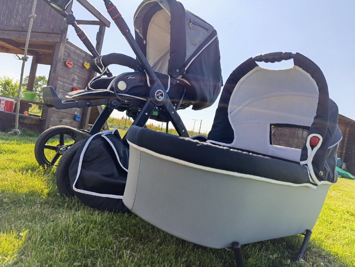Funkční,používaný,kvalitní kočárek německé značky Hartan. Má prostornou hlubokou korbičku ( délka 73cm, šířka 33 cm) i sportovní sedačku ( délka 94,šířka 36cm). Sportovní sedačka lze polohovat v oblasti zad i nožiček a lze napolohovat do úplného lehu a lze celou sedačku otočit o 180stupňů.Reflexní prvky, nenafukovací kolečka,která jsou uložena na ložiscích,takže je možné je jednoduše sundat.Přední kolečka jsou otočná o 360stupňů a mají možnost aretace. Do horšího terénu je možné vyměnit celou přední nápravu (větší kola) za tzv. Quad systém (prodávám zvlášť). Velkým plusem je také nastavení odpružení,buď je nastaveno na měkčí (houpací) mód nebo tvrdší sportovní mód. Na konstrukci je možné za pomoci adaptérů položit autosedačku značek Römer, Cybex, Maxi Cosi a Be- Safe. Na našem kočárku již je dokoupen adaptér pro Römer.Osobní odběr ve Štěpánkovicích či po domluvě Opava, Ostrava nebo FM.