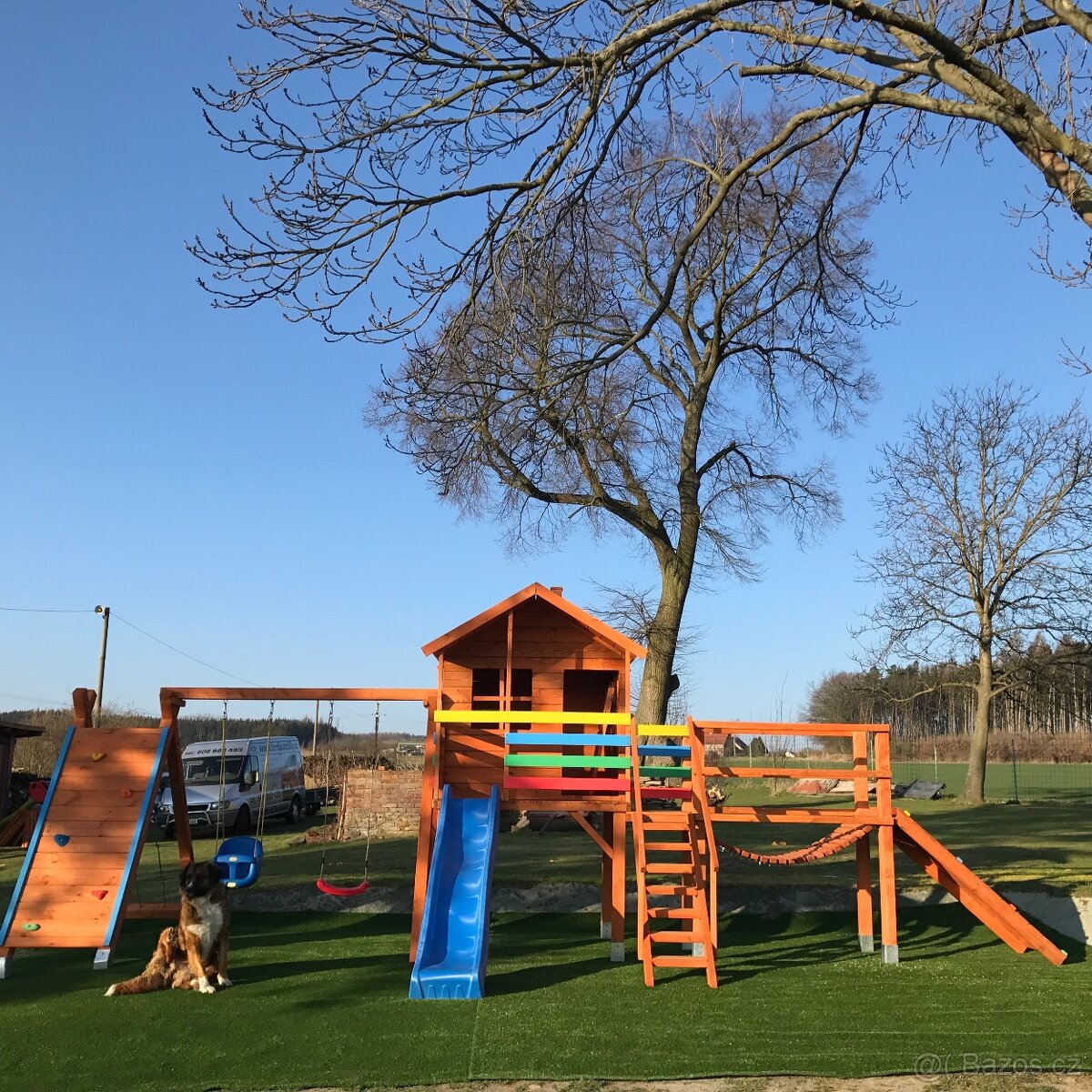 Krásné a kvalitní nové dětské hřiště, prolézačka ANEŽKA Obsahuje: 2x houpačka, skluzavka, horolezecká stěna s úchyty, lanová stěna, dřevěný žebřík s lávkou, domeček s dvěma okýnky a dveřmi s petličkou. Do spodní části domečku je možné umístit pískoviště. Je to velmi kvalitní provedení, masivní borové dřevo, již ošetřeno nátěrem, střecha je pokrytá šindelem. Nosné trámy 10x10cm. Barvu skluzavky a houpaček je možné si vybrat.
