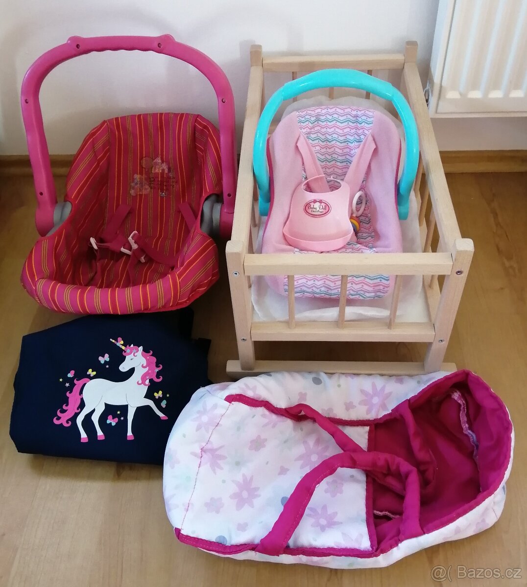 Dřevěná kolébka, autosedačka větší, autosedčka či nosítko menší a dvě nosítka pro panenku.