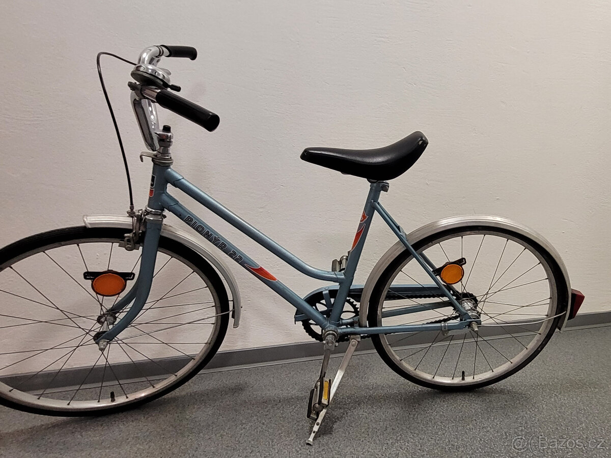 Nabízím klasické dětské kolo - Pionýr světlemodré barvy, má lehkou konstrukci, funkční, jezdí dobře. Vada: odřené sedadlo a ohlý chránič na řetez. (viz.foto)