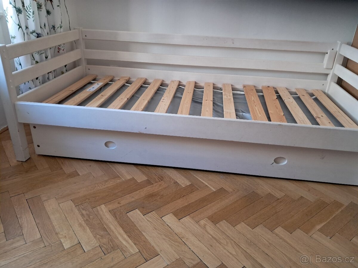 Prodám dětskou postel z masivu zn. DOMESTAV s přistýlkou o rozměrech 95 cm x 200 cm v bílé barvě. Známky opotřebení po dětech. Matrace nejsou součástí nabídky.