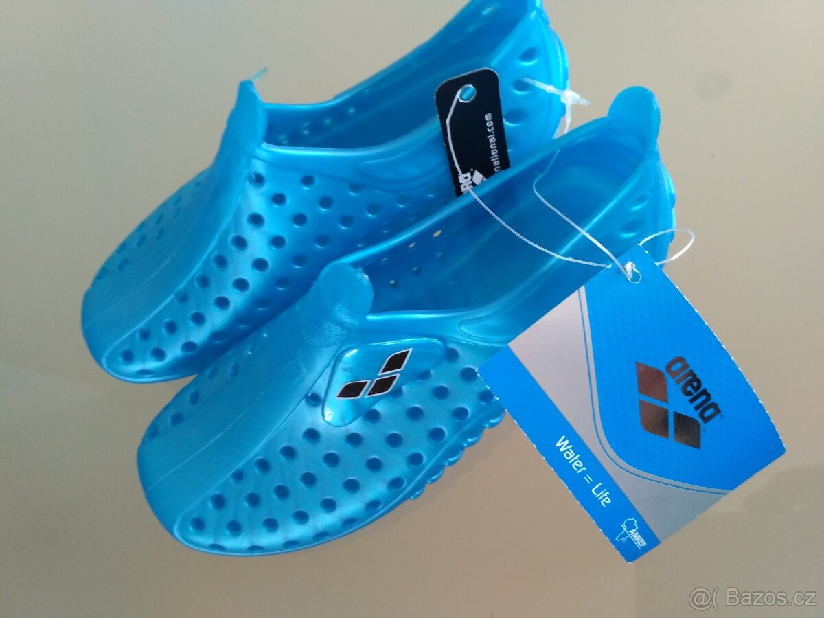 Značkové kvalitní vodní boty, které se hodí jak na bazén, tak na přírodní koupání a mohou zabránit poranění nohy od kamenů nebo ježků. Mají odtokové kanálky a díry, jsou prodyšné. Délka boty 19,5cm.