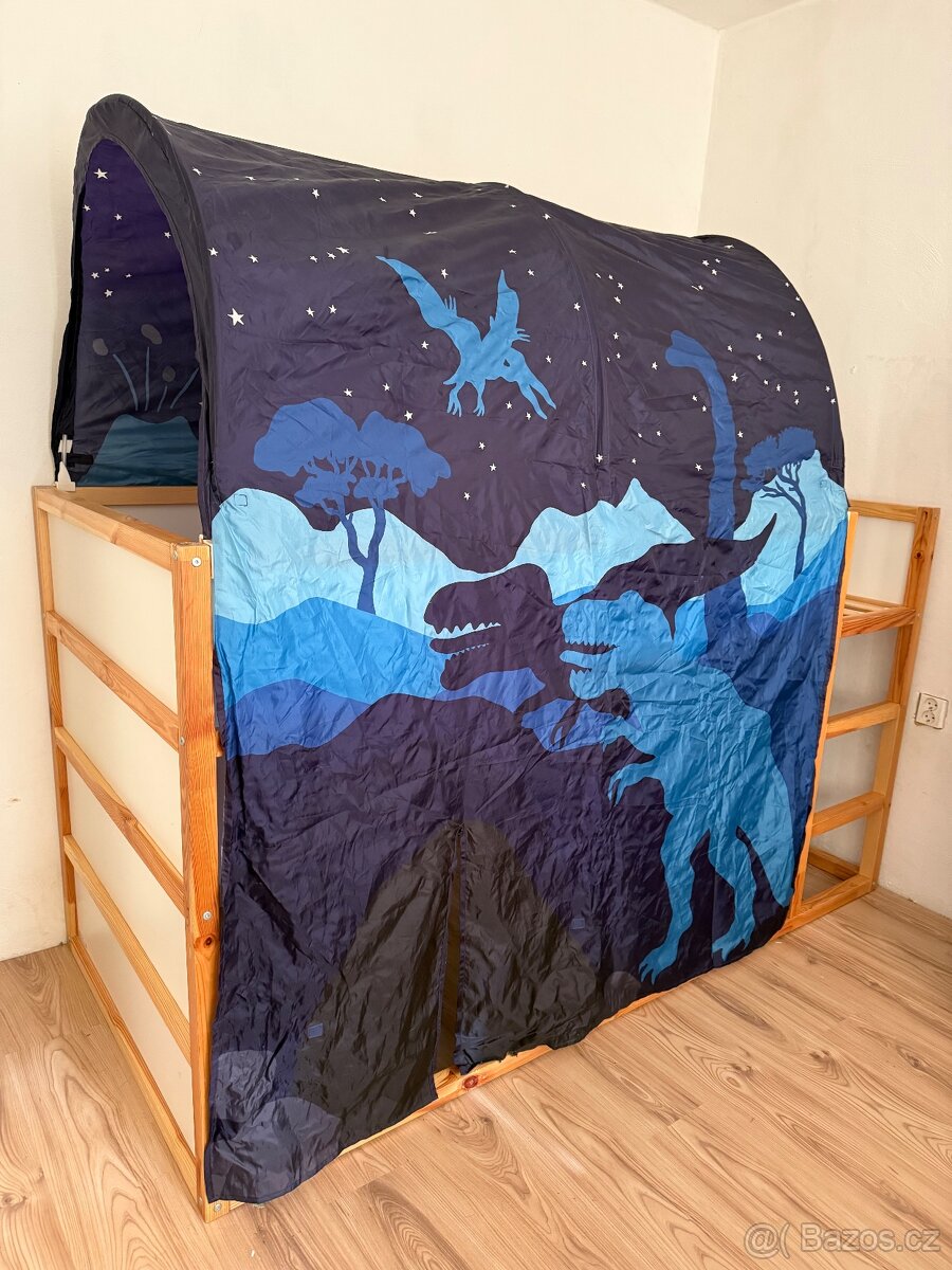 Prodám dětskou postel IKEA Kura. Lze používat jak patrová, tak i obrácená. K posteli i nebesa s dinosaury a záclony se stejnou tematikou. Postel je v dobrém stavu čista ,pevná . Prodávám bez matrace, je na klasickou matraci 90x200cm.