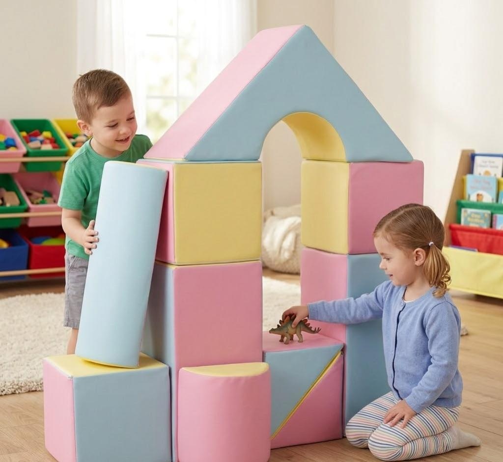 Bloky jsou měkké, lehké a nemají žádné ostré hrany – ideální i pro ty nejmenší. Odolný potah, který je příjemný na dotek a velmi snadno se udržuje (stačí otřít vlhkým hadříkem). Jemné pastelové barvy (modrá, růžová, žlutá), které skvěle zapadnou do každého dětského pokojíčku.