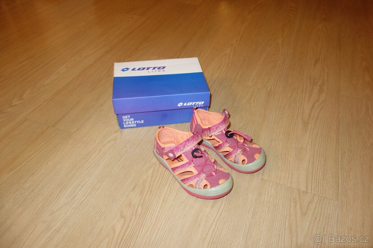 Prodám Lotto dívčí sandály v. 29. Nošené jedno sezónu, po jednom dítěti. Nesou známky opotřebení, viz foto. Délka stélky cca 19cm.