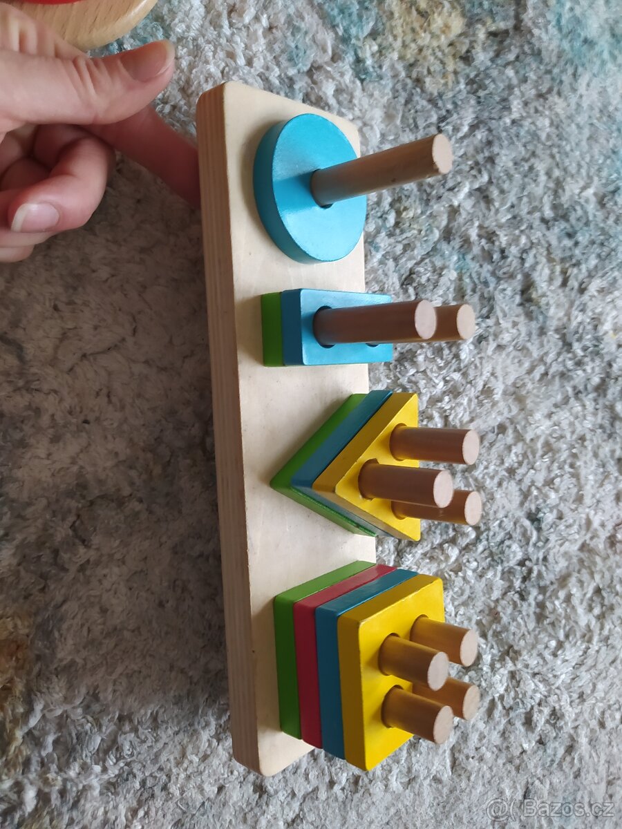 Prodám dětskou hračku třídění barev a tvarů = geometrické tvary (čtverec, obdelník, trojúhelník a kolo).