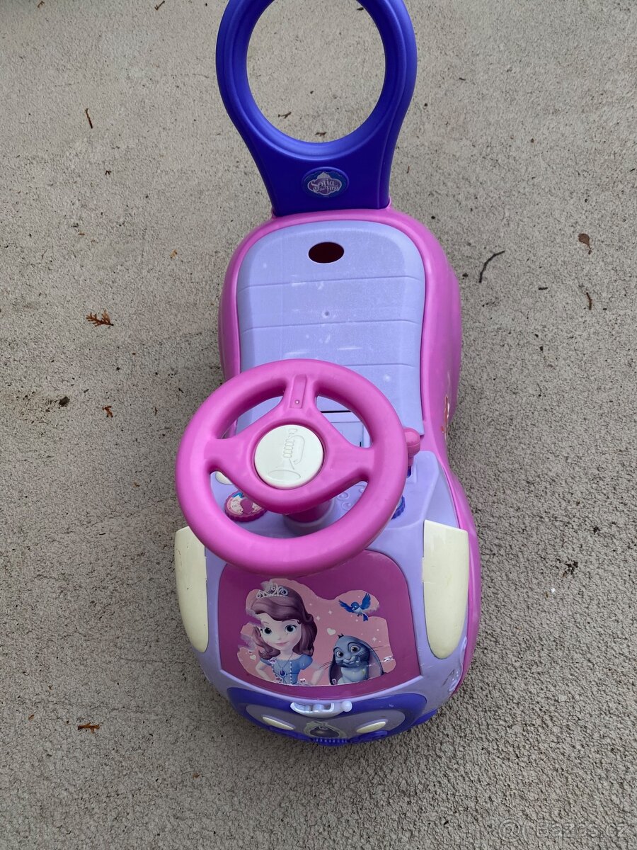 Prodám dětské odrážedlo. Používané! Vodící tyč lze sundat viz foto. Madla lze zvednout. Auto by mělo hrát viz čudlíky na volantu. Nutno dát nové baterie. Já to však nezkoušela. Proto prodávám jako nehrající melodií. Berte to ...