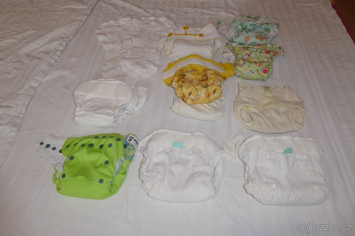 4 ks plenkových kalhotek vše v jednom – 2x kapsová plenka Bamboolík na suchý zip se vkládací bambusovou plenou (dekor sovy a mořská zvířata), 1 x zelené kalhoty zn. Anavy na patentky se dvěma plenami (krátká a dlouhá, lze kombinovat), 1 x kalhotková plena zn. Grovia se 2 vkládacími plenami