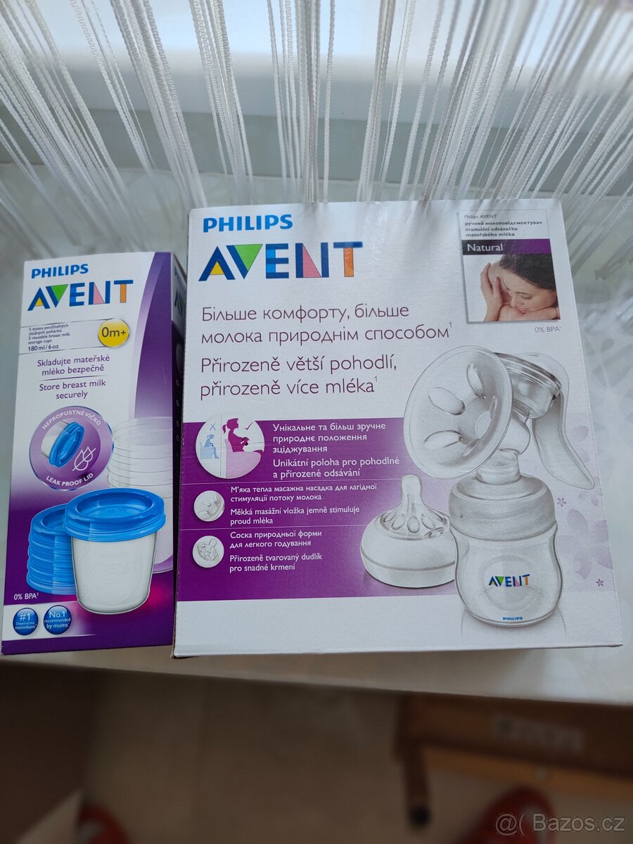 Ruční odsávačka mateřského mléka, použita jen při potíží zánětu, zásobníky na odstrikane mlicko nepoužité,v originálním balení. Lahvička se savičkou též nepoužitá.