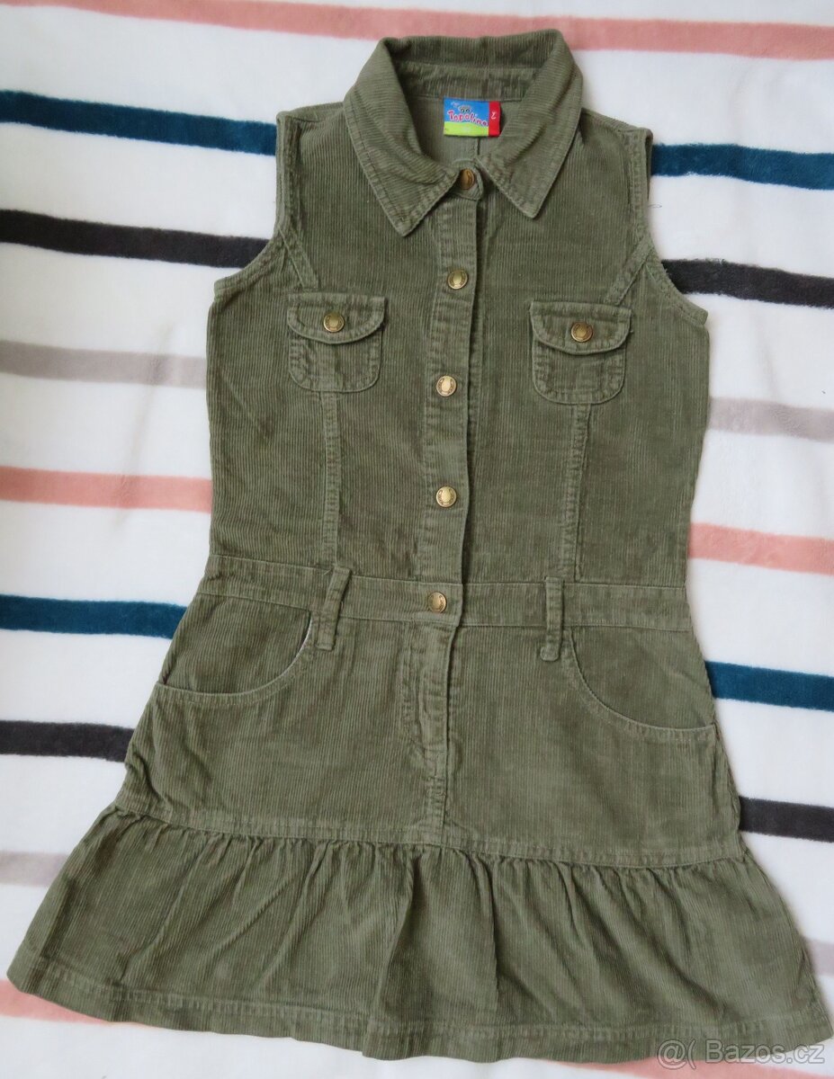 Prodám dívčí šaty, měkký manžestr, khaki barva, límeček, zapínání na patentky, v poklopci krátký zip, všechny kapsy funkční, dole volán, detaily s koněm. Délka od ramene dolu 67,5cm, průramky 35cm, pas 34cm, výrobce Topolino, velikost 122. Nošené minimálně, super stav. Zásilkovna 89 Kč, Balíkovna 75Kč, osobní odběr Příbram.