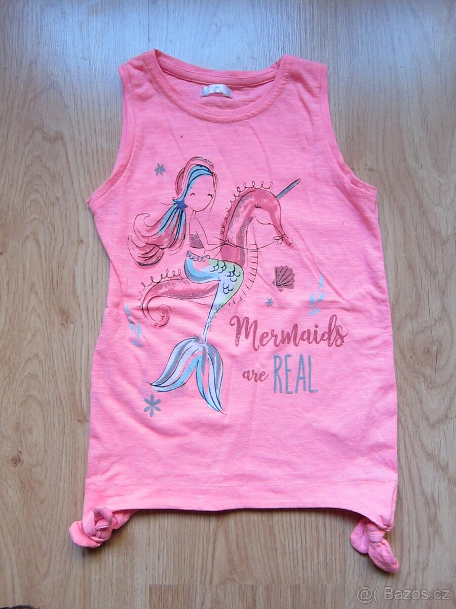 Dívčí top bez rukávů vel.122, růžová neonová barva, s obrázkem malé mořské víly a jednorožce-mořského koníka, bez vad, materiál 60% bavlna a 40% polyester. Značka Pepco.
