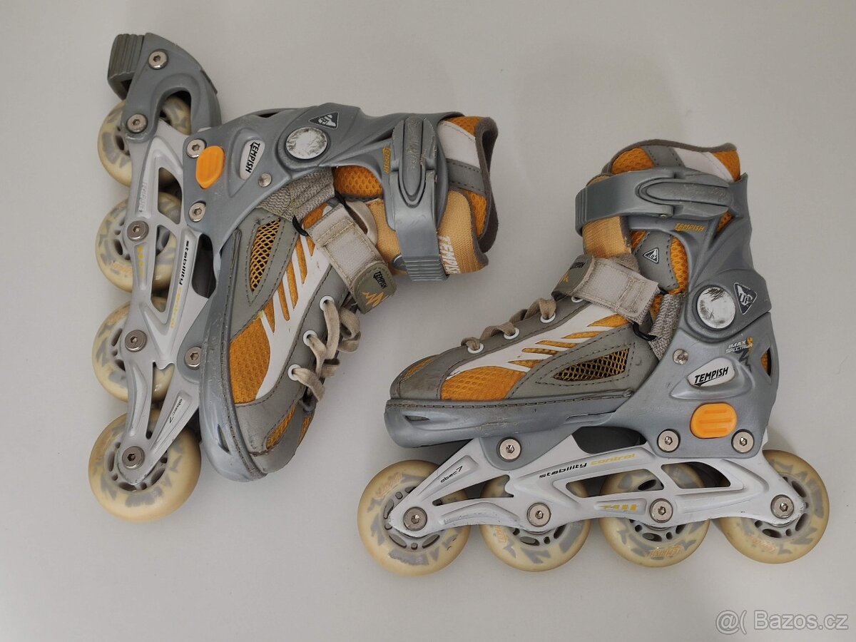 Univerzální stříbro-šedá barevnost se žlutými detaily. Česká značka Tempish. Kolečka s kvalitními ložisky ABEC7 - minimální opotřebení. Hladký, tichý chod. Změna velikosti tlačítkem v patní části. Všechny části funkční.