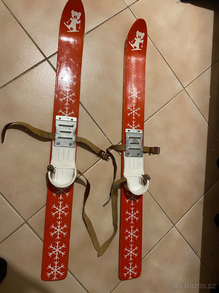 Detske lyze maji 82 cm na delku, bota ditete se upina pasky.