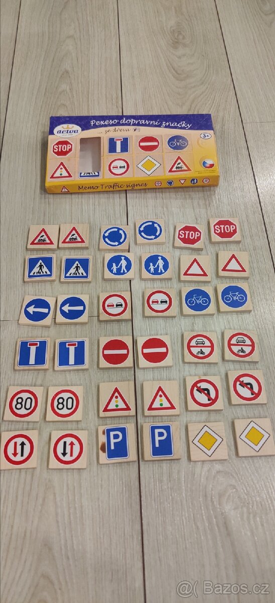 Pexeso s motivy dopravních značek obsahuje 36 ks dřevěných kartiček o rozměrech 4 x 4 x 0,6 cm.