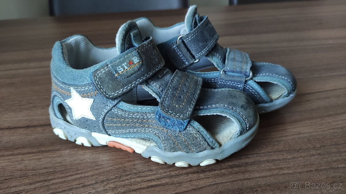 Sandále vel. 25, kožené, vnitřní stélka 16cm. Kupované v Německu, značka Bären Schuhe, nošené jedním dítětem. Dva suché zipy, krytá špička, drží skvěle, dobře se obouvají a krásně sedí, vyšší pata. Doporučuji, jen vzadu upadla hvězdička a zevnitř na jazyku malá dírka (při obutí není vidět). Jinak v pořádku.
