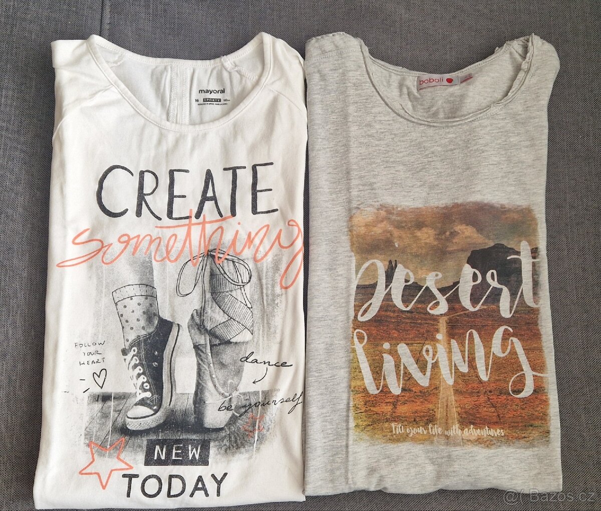 Prodám dívčí značková trička španělské značky Mayoral a Baboli obě vel.162. Bílé tričko s nápisem a zadním rozparkem je značky Mayoral (95%bavlna, 5%elastan).Šedé tričko s nápisem a ozdobou na rukávech a bocích je značky Baboli (87%bavlna, 7%elastan, 6%viskóza).Obě jsou nenošené pouze jednou vyprané, v top stavu. Doprava dohodou.Mám i další inzeráty. Cena je uvedena za kus.