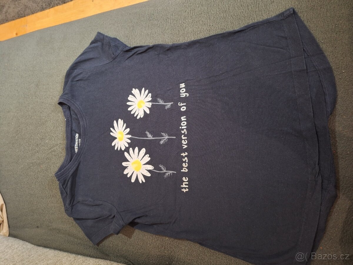1) tmavě modré triko s nápisem a puntíky, velikost 134.
