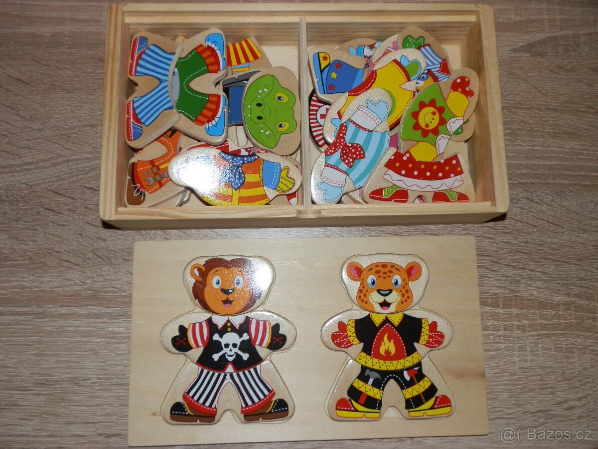puzzle Frozen a Sofie první + dřevěná skládačka - [19.3. 2026]pro nejmenší, bez vad, dřevěná skládačka lidské tělo od kostry přes svaly, kůži a oblečenou holčičku, komplet 120Kč