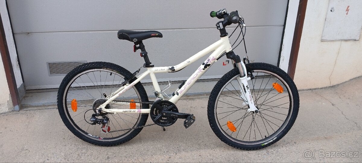 Prodám použité dětské kolo Superior 24", hliníkový rám, pružinová vidlice, řazení Shimano Revoshift, přehazovačka Shimano Tourney, přesmykač Shimano Tourney, převody 3x7, nové pláště, košík na láhev, odrazky, zvonek, plně funkční a připraveno na sezónu. Inzerát je aktuální do smazání, po dohodě možnost poslat.