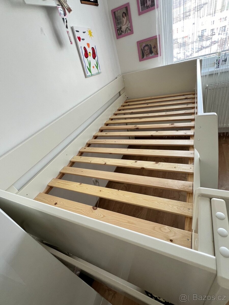 Zvýšená dřevěná dětská postel se žebříkem - [4.2. 2026]Prodám zvýšenou dřevěnou dětskou postel se žebříkem, pro matraci 190x80cm. Výška lůžka 94 cm s volným prostorem pod lůžkem výšky 73 cm, možnost instalace závěsu. Vnější rozměry 197x89 cm, celková výška 115 cm. Nepoškozená, malé známky opotřebení (po ...