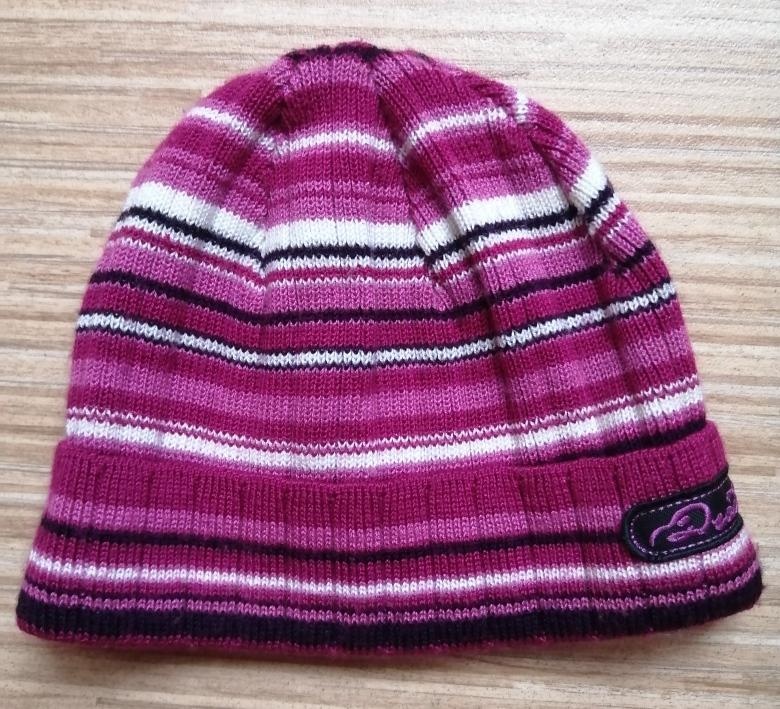 Pletená růžovofialová čepice, dle etikety velikost 52-54 cm. Obvod v klidu 2x 22-27 cm, výška 18 cm. Nošená při velikosti cca 104-116
