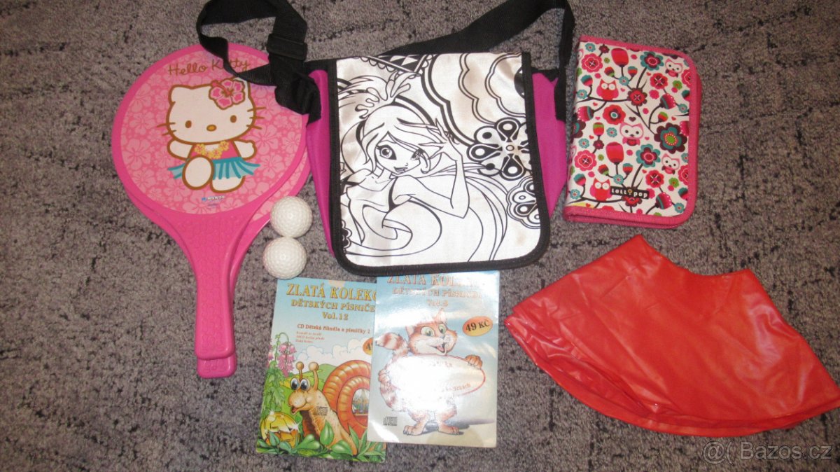 balíček obsahuje: nafukovací kruh průměr 48 cm, 2 tenisové rakety s 2 míčky Hello Kitty, 2 x CD s dětskými písničkami,1 používané pouzdro, 1 dětská kabelka /obrázek se může vybarvit/. Cena za vše 150 Kč. Osobní odběr Zborovice nebo Kroměříž Prosím nepište SMS, ale volejte nebo odpovězte na tento inzerát.