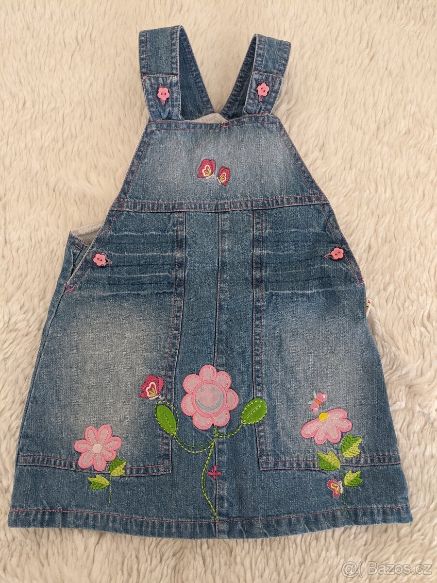 Dívčí džínová laclová sukně. Vel. 86. Světle modrá s výšivkou kytiček a motýlků. Zapínání na knoflíky. I po stranách knoflíky. Uvnitř jmenovka. Koupená v Německu. Nošená. Na jednom místě skoro neviditelné zašití a na jednom místě trošku vytahané nitky - viz poslední 2 fotky. Pěkná, určitě ještě někomu dobře poslouží.