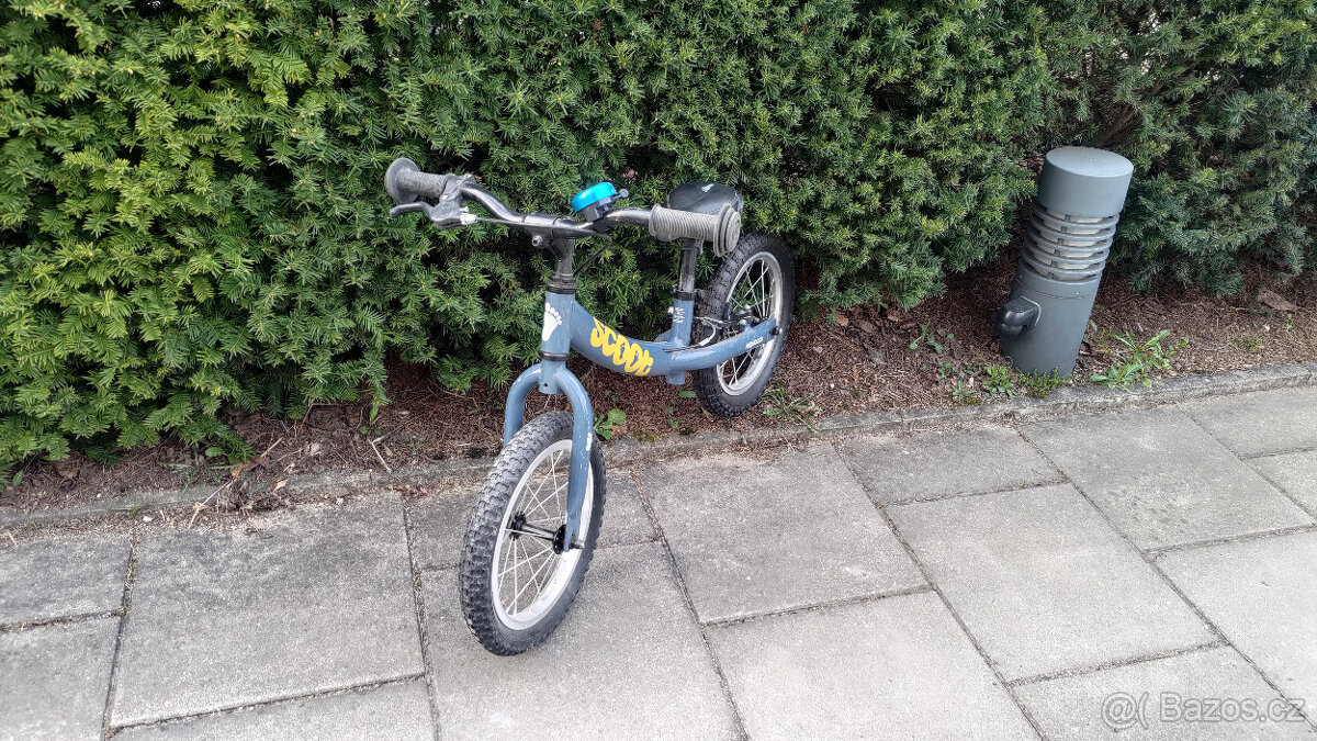Kola nafukovací s pneu 14´x 1,75, autoventilek, zadní plášť je zánovní. Plnohodnotná ruční brzda V-brake, měkké sedlo, rychloupínák na sedle. Materiál: kov (rám). Na sedle je vzadu madlo pro snadné nošení.