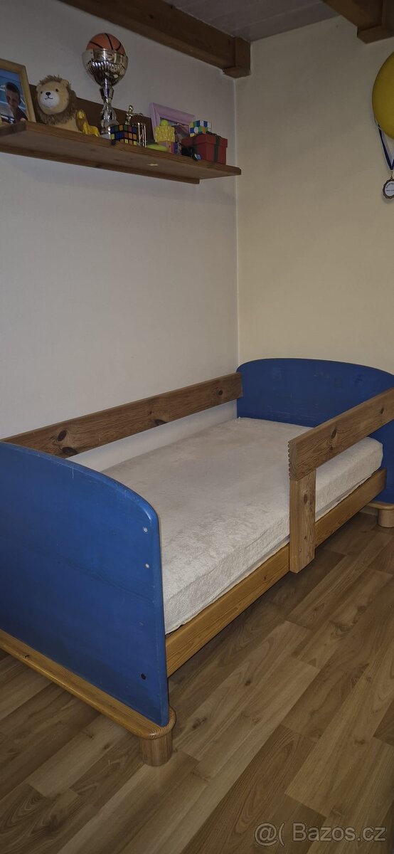 Dětská postel s matrací - [28.3. 2026]Nabízím postýlku z masivu, se šuplíkem, používanou na chatě. Přidám i matraci. Bez poškození s odnímatelnými šprušlemi, 3 výšky.