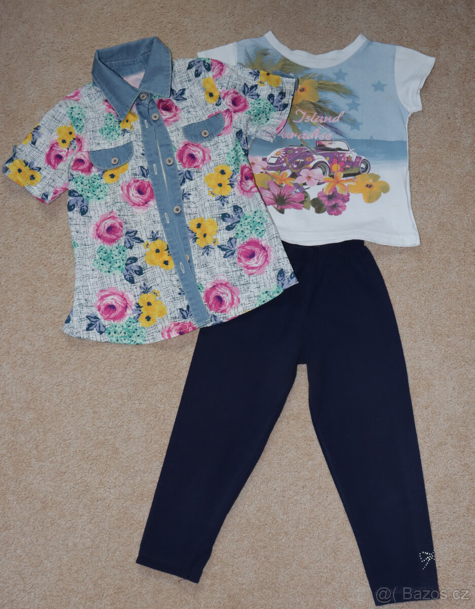 3 dílna souprava: legíny 3/4, bílé tričko s potiskem a barevná halenka. Vel. 116.