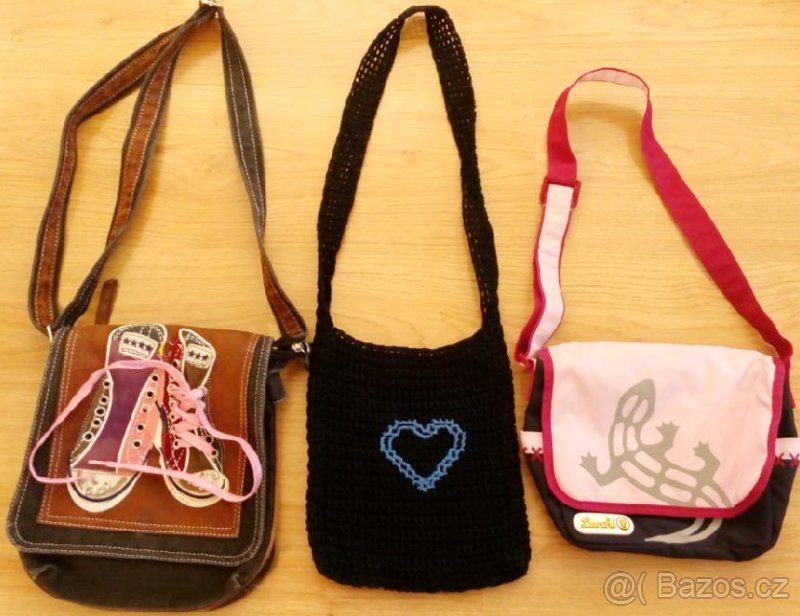 Prodám dívčí tašky-kabelky:s teniskami 23x28x7cm,nošená,nošení je trošku znát,cena 250kč,s ještěrkou 22x22x7cm,nepoužitá,cena 170kč,černá se srdcem 25x20cm,nošena krátce,moc hezká,cena 100kč ,nebo všechny za 400kč.