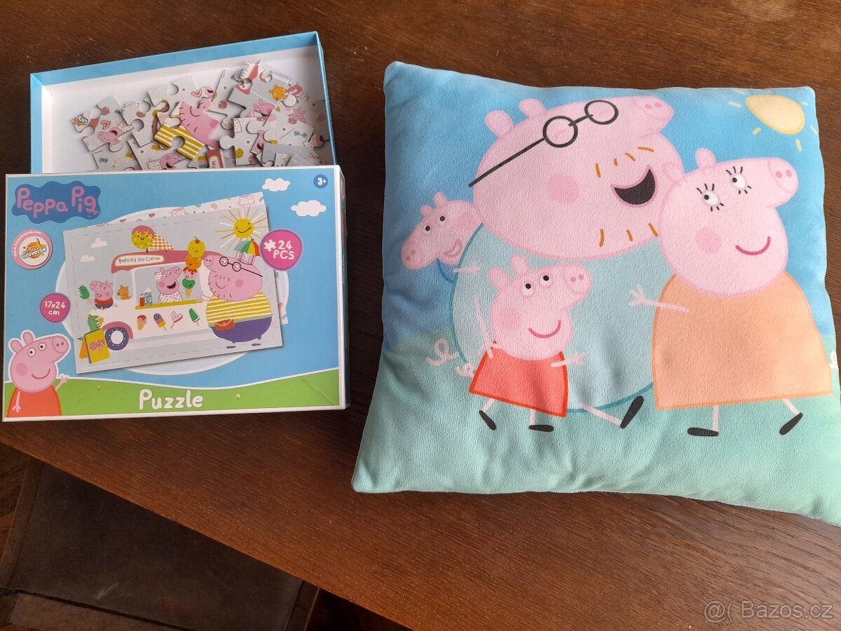 Puzzle Prasátko Peppa za 50 Kč a polštářek Prasátko Peppa za 80 Kč.