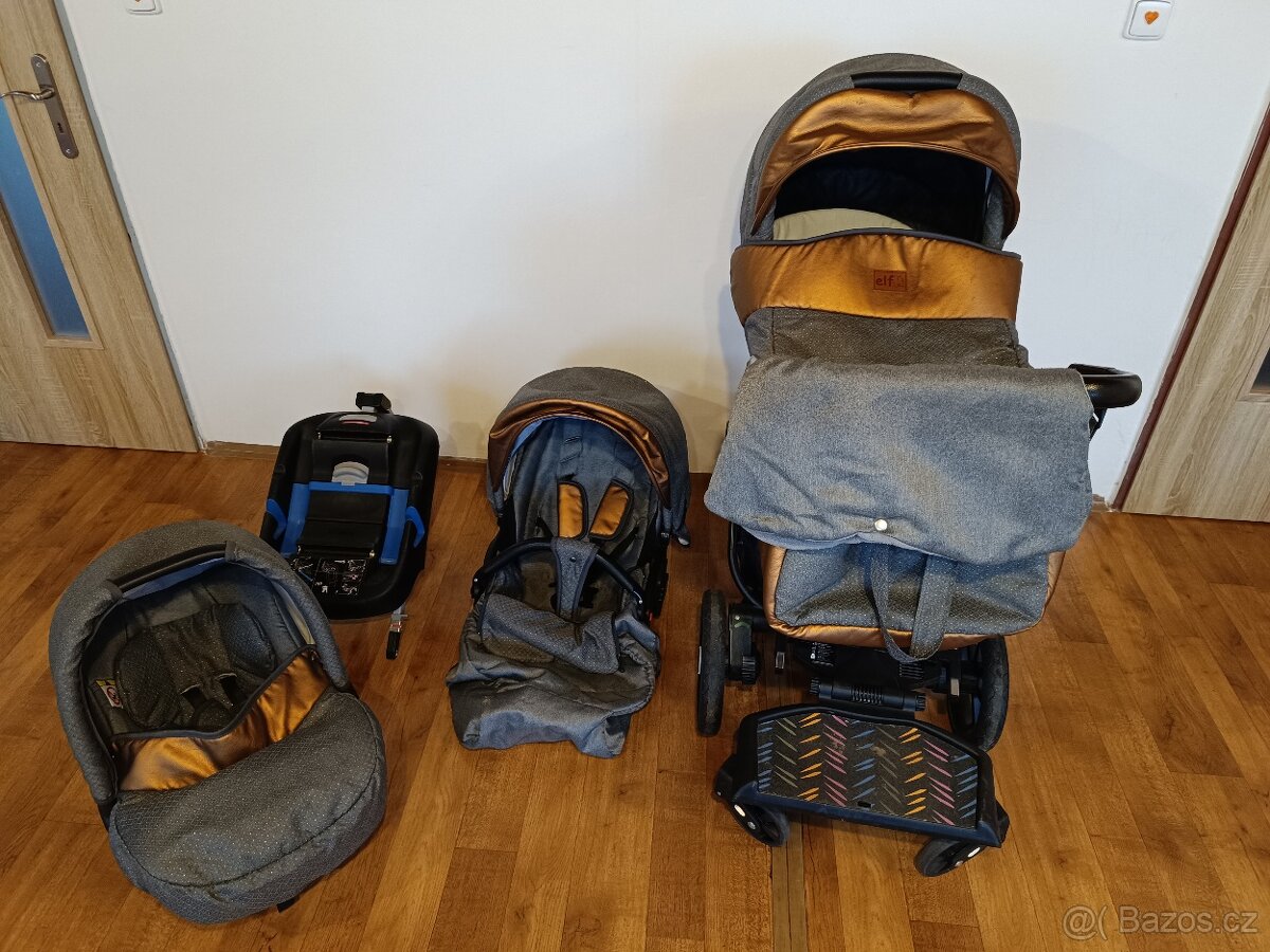 Výbava- rukávník v barvě kočárku elfan s s fleecem, zavinovačka s fleecem, rostoucí zimní fusak s ovčí vlnou, zimní vložka do kočárku, jarní fusak, kola polyuretanová, kočárková taška, síťka a pláštěnka, stínítko, náhradní návleky na pásy, náhradní povlečení na matraci, 2 matrace, 2 mantinely, popruhy do korby, necháme ke kočárku i stoupátko pro druhé dítě.