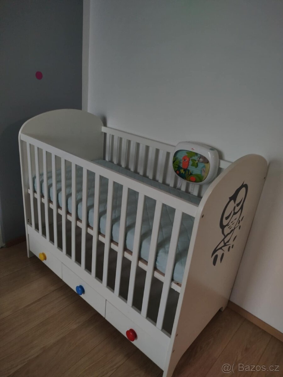 Dřevěná postýlka Tomi Elephant s matrací - [26.4. 2026]Dětská postýlka vyrobená z borového dřeva s vyjíždějícím šuplíkem vespod. Bílá varianta (tenký nátěr, dřevo lehce prosvítá). Vnitřní rozměry 120 x 60 cm. Tři úrovně montáže podlahy, tři odnímatelné příčky na přední straně. Gravírování na obou horních ...
