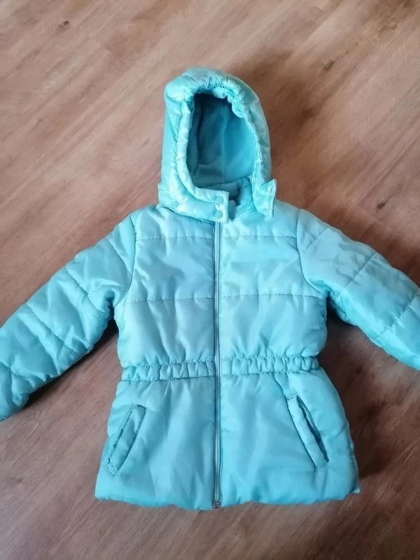 Zimní bunda 110-116 cena 300kc,zateplena, nošená,moc pekna, to blýskavy opadava
