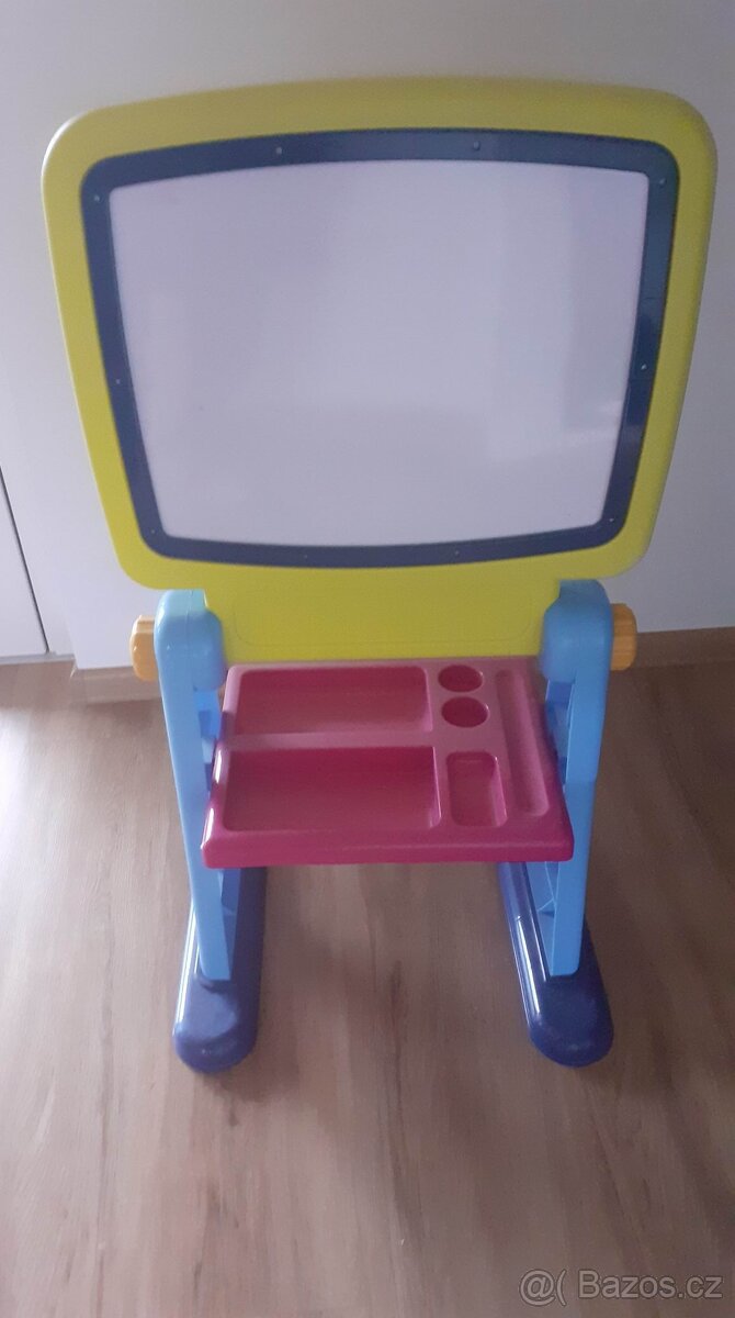 Dětská magnetická a popisovací tabule. Z přední strany bílá popisovací a magnetická tabule, ze zadní možnost připnout pomocí klipů výkresy. Pod tabulí odkládací polička na pomůcky. Celková velikost: 95x50 cm. Velikost samotné tabulky: 40x32cm. Možnost osobního předání: Jihlava, Brno, popř. Frýdek-Místek.