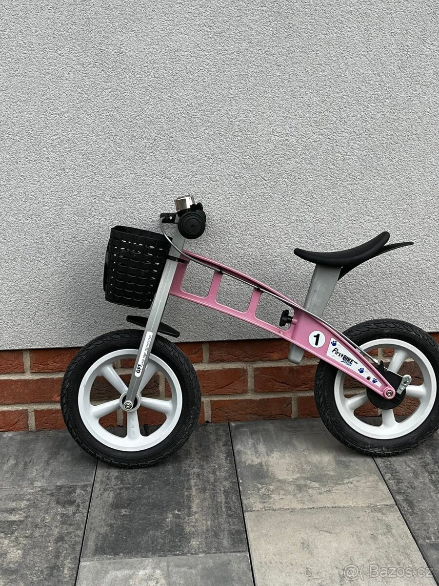 Nabízím odráželo First bike. Dokoupen košík a zvoneček + helma Abus smiley princess velikost M (50-55cm). Cena 2000,-