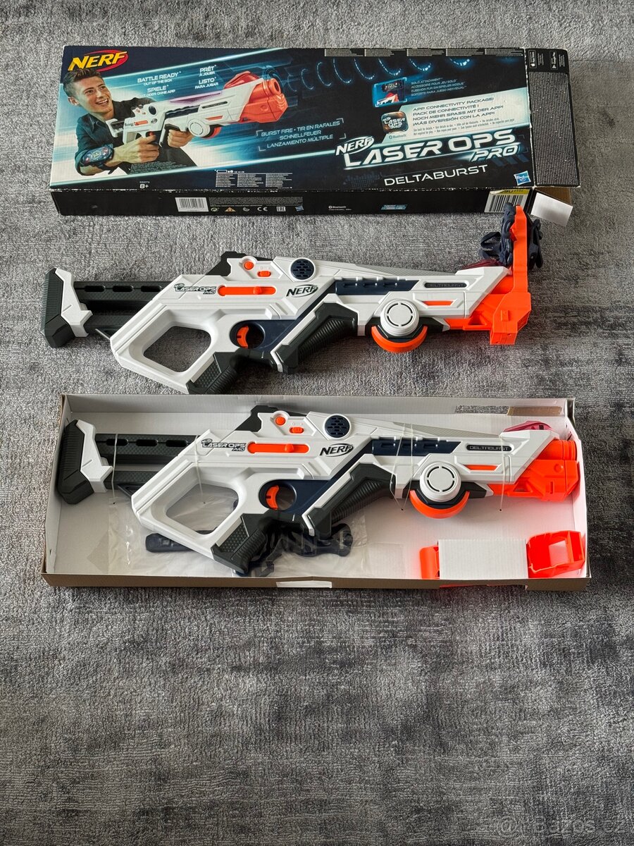 Malé pistole Nerf - [11.3. 2026]Hrané, nepoškozené, super na narozeninouvou párty, kdy se sejde více dětí. Mám spousty nábojů, stačí si o ně napsat, používané i úplně nové. Rozměry: 5 × 23 × 19 cm. Vhodné pro děti od 8 let. Pistole s laserovým zaměřováním, dostřel až 22 metrů, je ...