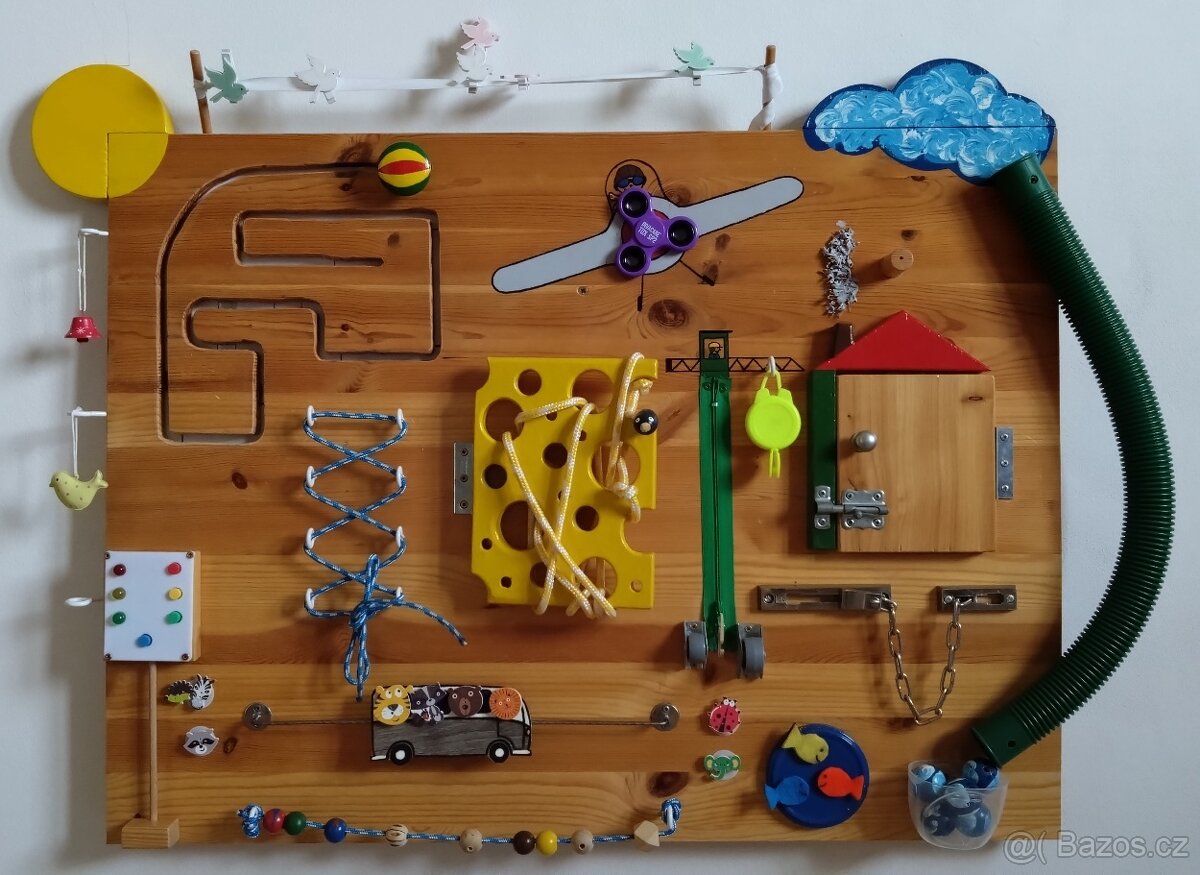 Activity board - [1.3. 2026]Prodám tento krásný a plně funkční activity board (motorickou desku). Je to ideální edukační hračka pro rozvoj jemné motoriky, soustředění a trpělivosti vašeho dítka. Deska byla používána, ale je v perfektním stavu a připravena dělat radost dál.