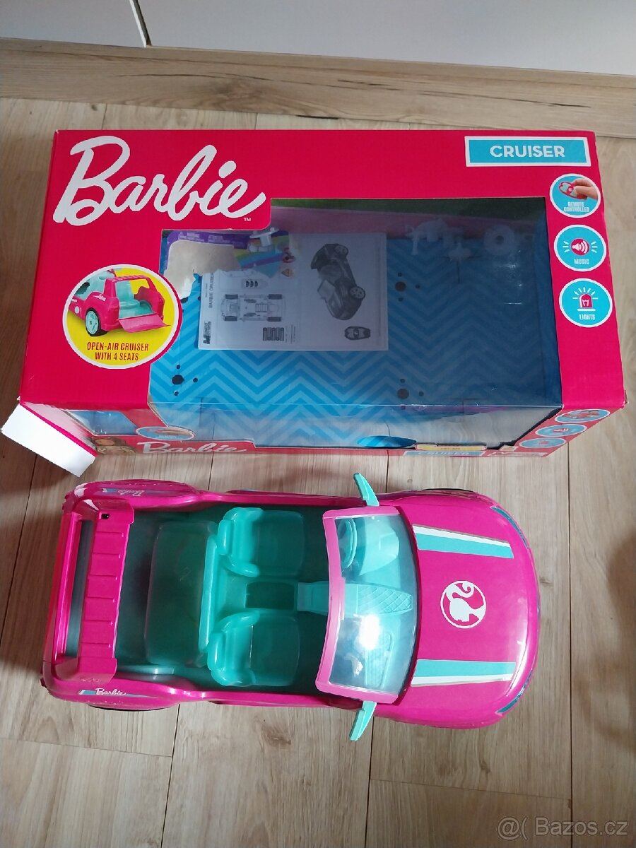 Prodám růžové auto Barbie na dálkové ovládání, svítící svetla, zvukové efekty. Cena 800 Kč. Modré auto bez zvuku 150Kc.