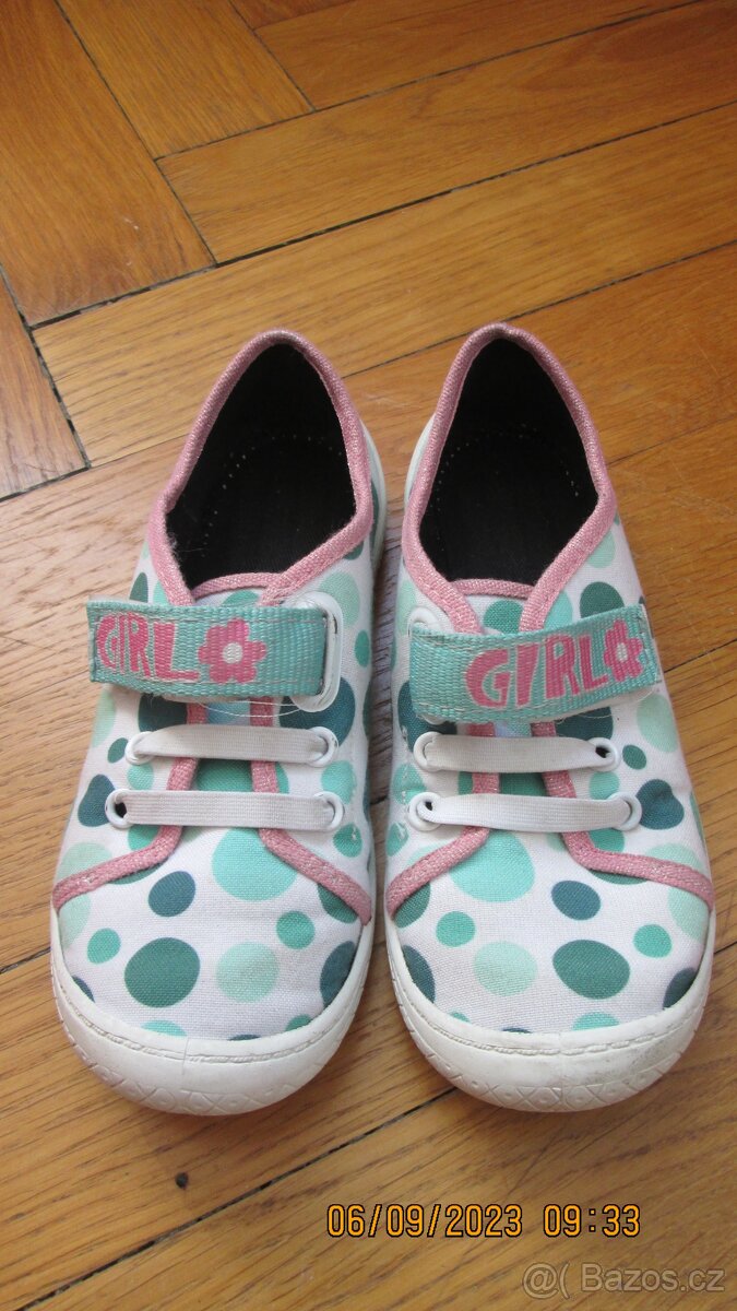 Prodám dívčí plátěnky/tenisky/bačkory. Stélka 19,5 cm, zapínání na suchý zip, podrážka odvětraná. Nošeny pouze na tělocvik. Krásné, čisté, v perfektním stavu. Osobní předání Praha nebo Balíkovna.
