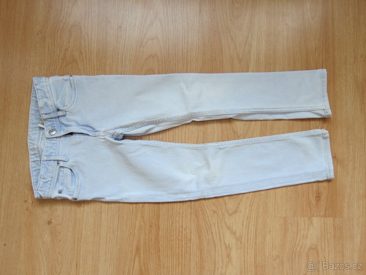 Světle modré rifličky vel. 116, verze slim, značka HM, drobný světlý flíček nafocen, jinak bez vad.