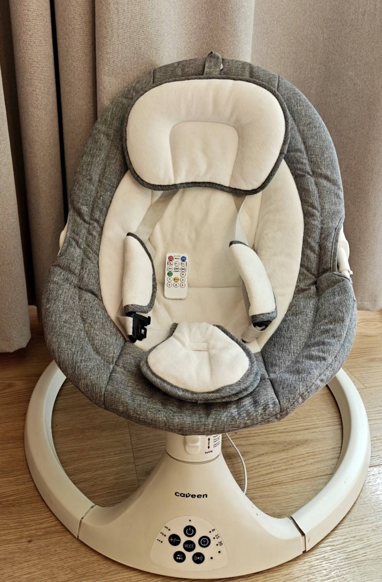 Dětská houpačka Caveen s bluetooth, 5 rychlostí houpání, 3 polohy sezení, napájení adaptérem a bateriemi