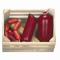 Dřevěná přepravka obsahuje 6 kusů dřevěných dekorací uzenin do dětské prodejny. Hračka je originál zabalená v krabičce o rozměrech 16,5 x 11 x 8 cm.