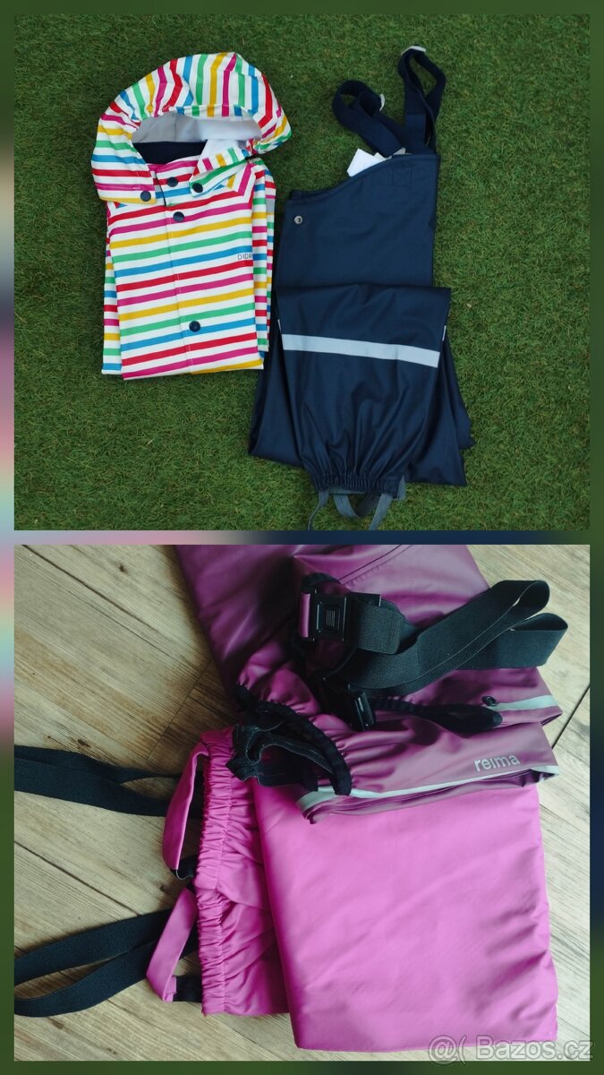 1) Gumové nepromokavé laclové kalhoty do deště Reima (128) jsou ty vínové. Naprosto bez vad. Měli jsme jich vícero. Nastavitelná celková délka max. 112 cm, nohavice do rozkroku 50 cm Za 390,--